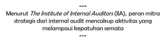 Beberapa aspek dari peran strategic business partner dan trusted advisor mencakup: (1) Manajemen risiko yang proaktif. Yakni menggeser peran dari audit reaktif menjadi antisipasi terhadap munculnya risiko baru, seperti cybersecurity atau perubahan regulasi, dan memberikan advis yang real-time dan berorientasi ke masa depan; (2) Penyelarasan strategi. Menjamin rencana audit selaras dengan tujuan-tujuan strategis dan sasaran-sasaran bisnis dari organisasi; (3) Fungsi advisory. Memberikan insight untuk meningkatkan kualitas pengambilan keputusan, seperti optimalisasi proses bisnis, melakukan evaluasi terhadap implementasi teknologi, dan memperkuat ketahanan organisasi;
